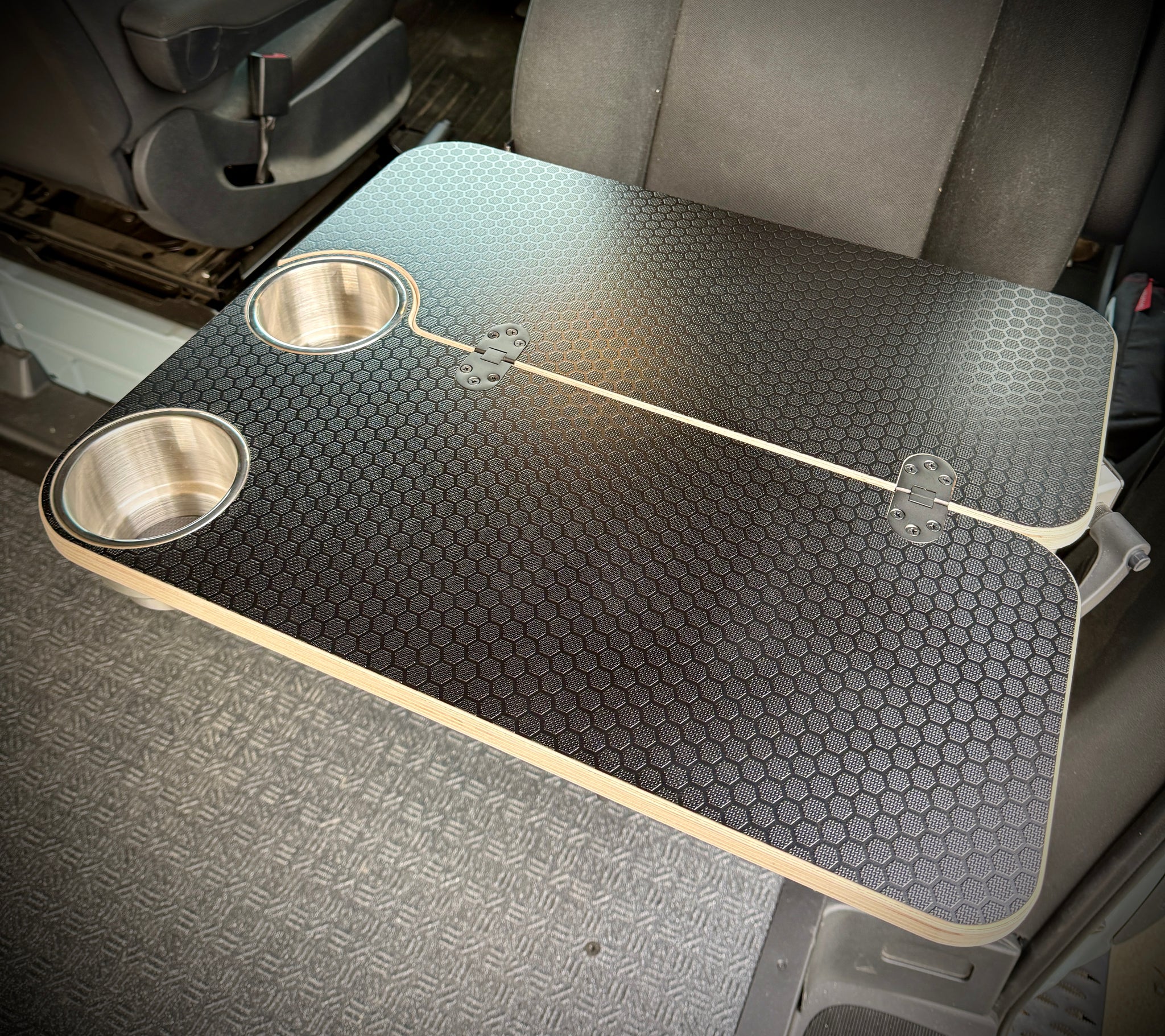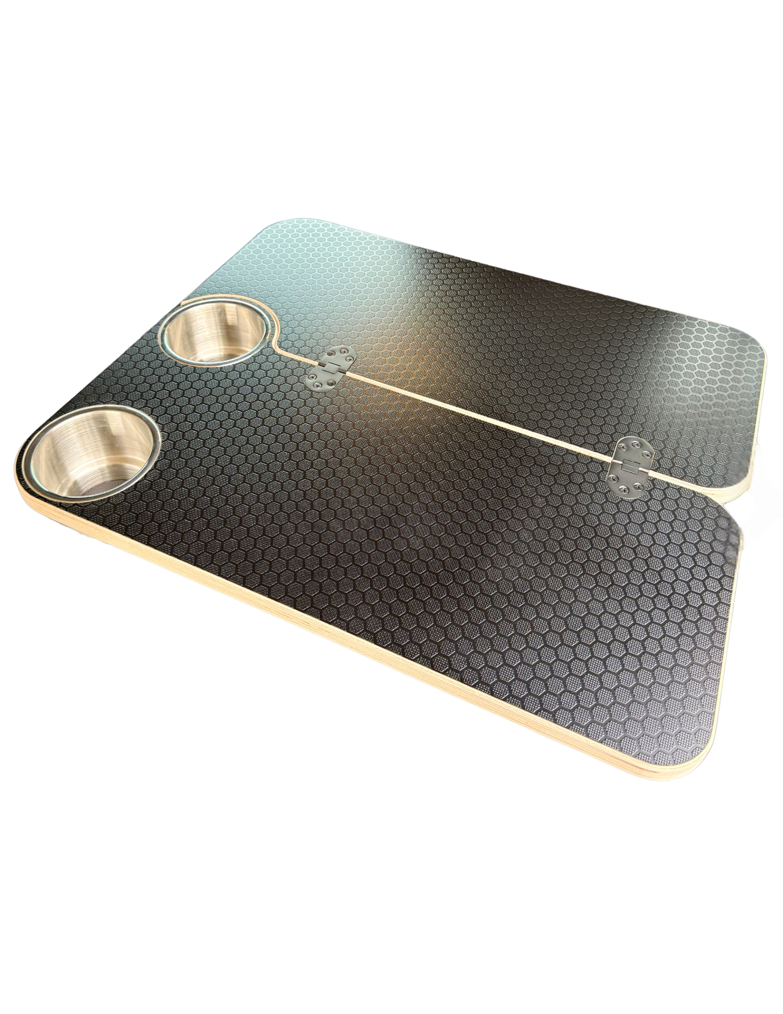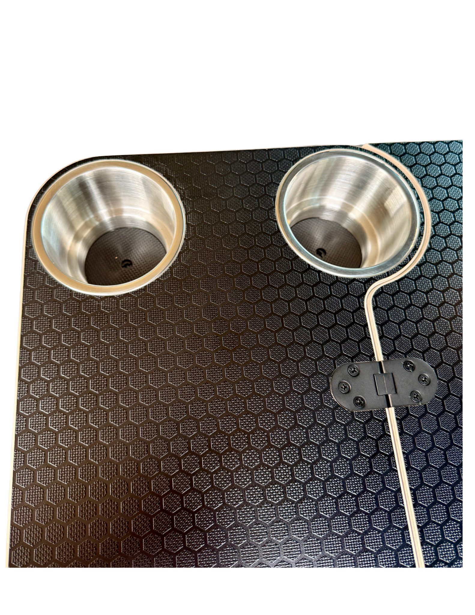 Two integrated stainless steel cupholders keep drinks secure. When the table is folded closed, one cupholder remains accessible, allowing continued use in tight spaces or while traveling. Hinges are mounted on top and remain exposed in the open position for a clean, durable folding mechanism.