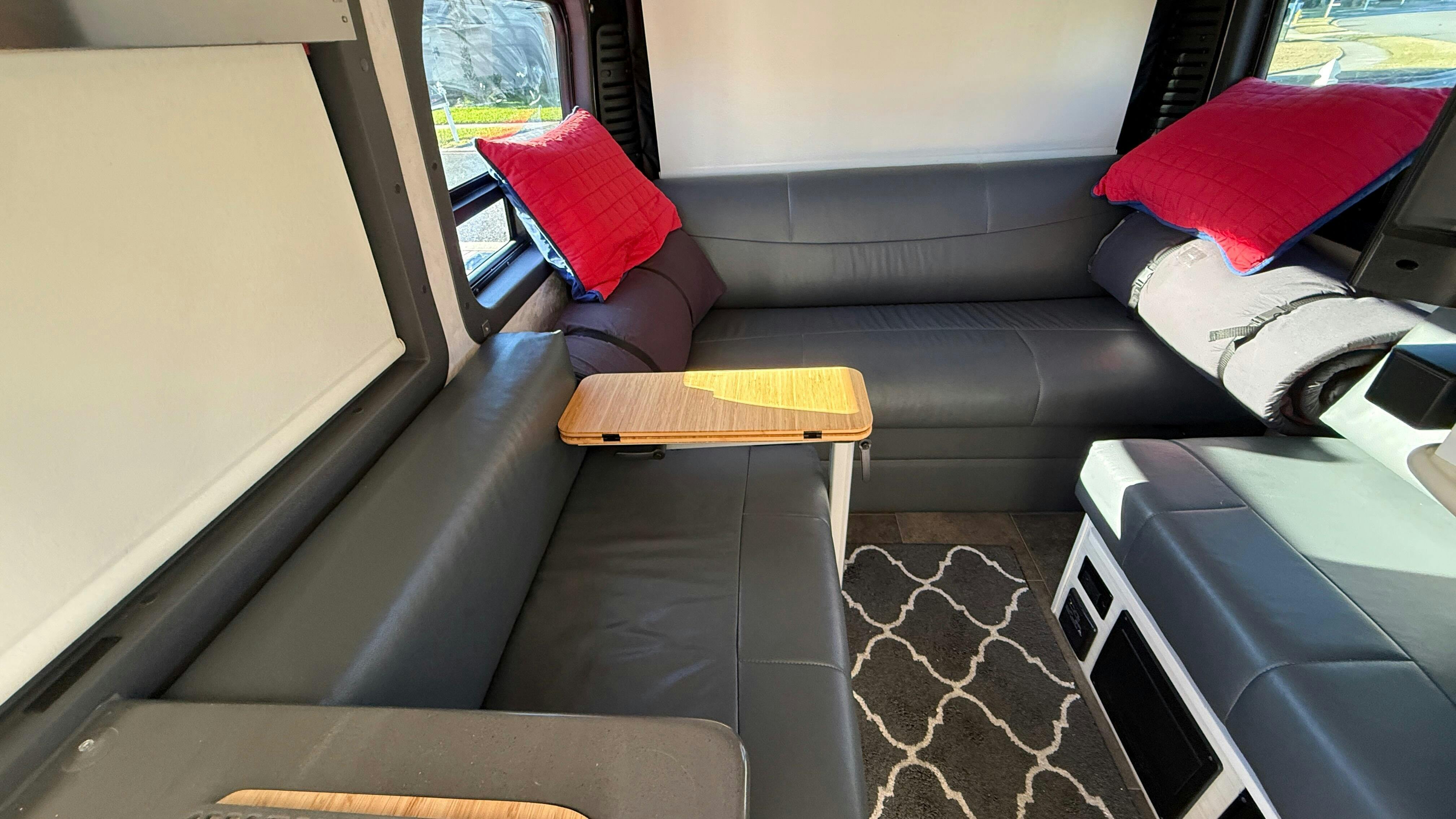 A slim version of our original folding bamboo table that folds in half, made for Lagun mounts. This slim table is made specifically for the front of your camper van or RV (mounting hardware not included). Works well with the slim Lagun base mount, mounted to the inside front seat passenger base as pictured. When folded closed it is 21 1/2" x 8", when fully extended it measures 21 1/2" x 16". Hinges are on top and exposed in the open position. Not recommend for use while the vehicle is in motion. Â