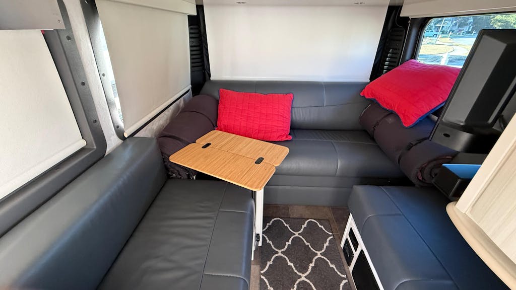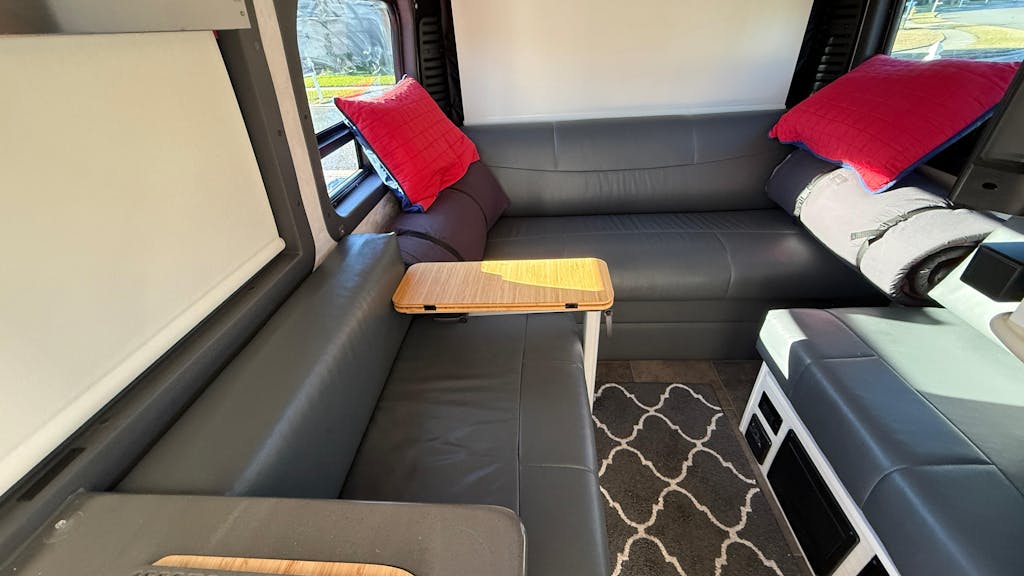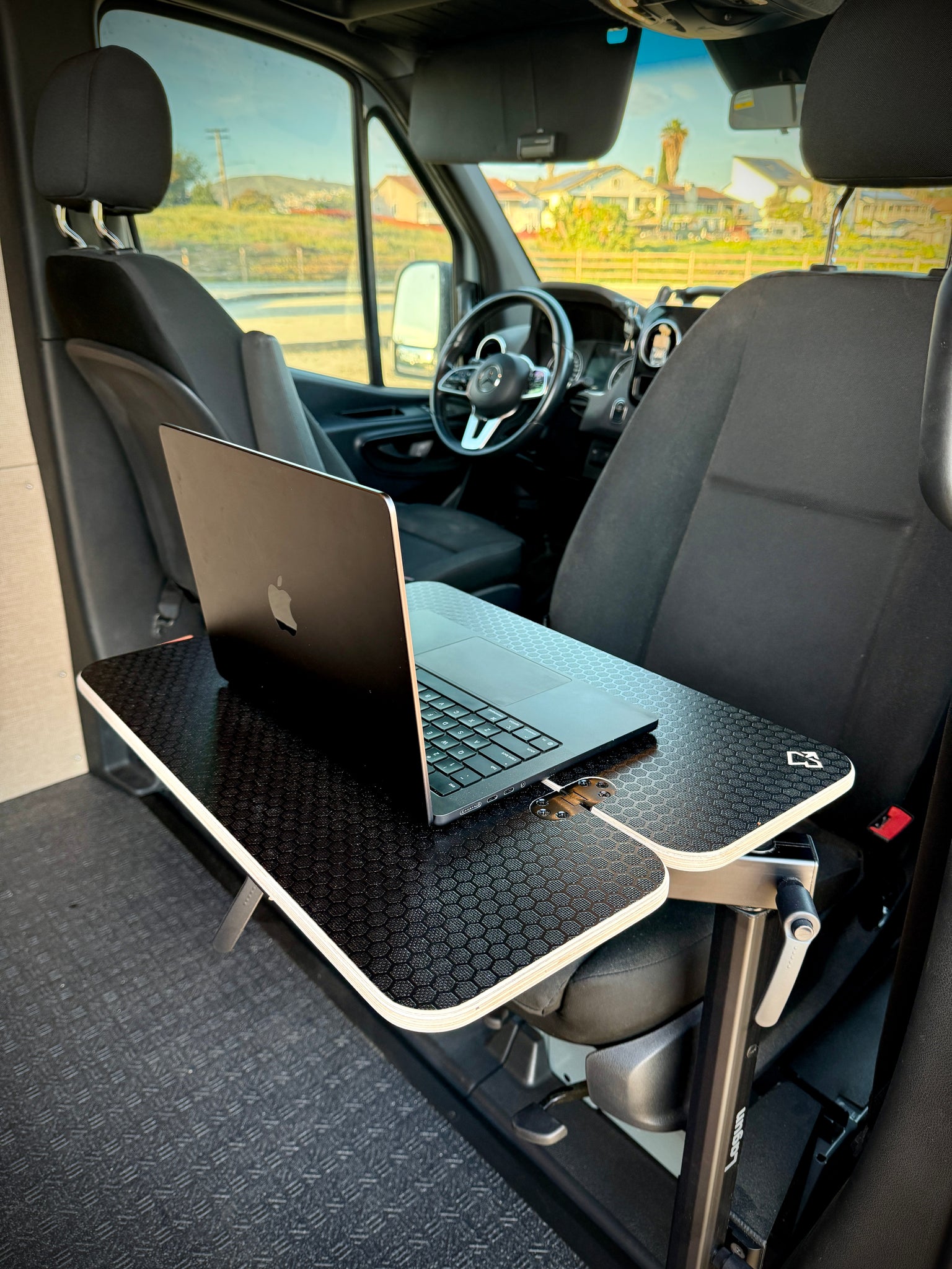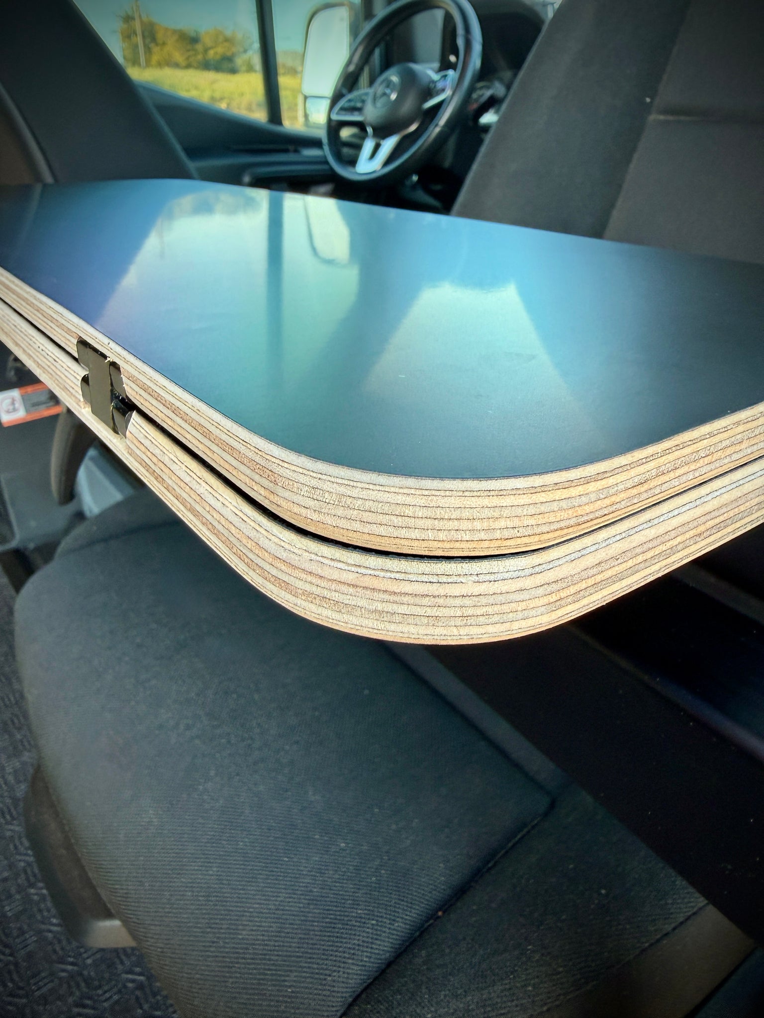 A slim version of our original folding Black Hex table that folds in half, made for Lagun mounts. This slim table is made specifically for the front of your camper van or RV (mounting hardware not included). Works well with the slim Lagun base mount, mounted to the inside front seat passenger base as pictured. When folded closed it is 21 1/2" x 8", when fully extended it measures 21 1/2" x 16". Hinges are on top and exposed in the open position. Not recommended for use while the vehicle is in motion.